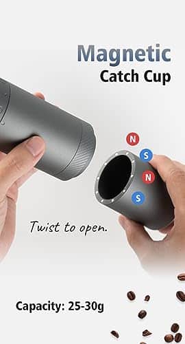 The X-Ultra has a slim body and moderate size, making it highly portable. The magnet catch cup has a capacity of 25-30g, allowing you to grind enough coffee for a single cup. The compact design and foldable crank handle make it easy to carry and store.