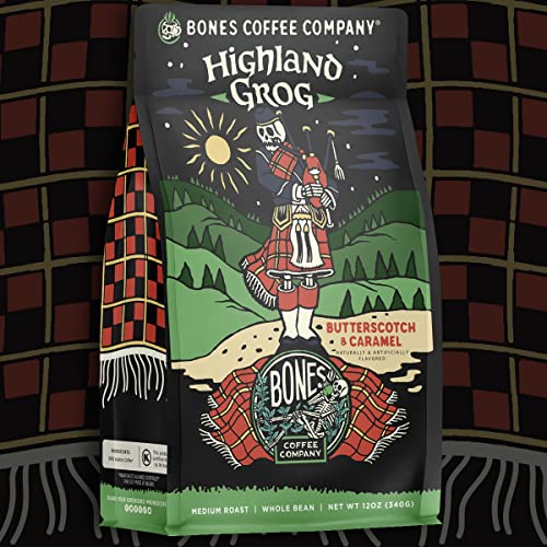 Bones Coffee Company Highland Grog Flavored Ground Coffee Beans Butterscotch Caramel | 12 oz Medium Roast Low Acid Coffee Arabica Beans | Flavored Coffee Gifts & Beverages (Ground)