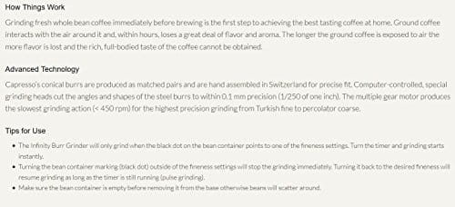 8257 reviews for Capresso 560Infinity Conical Burr Grinder, Brushed Silver, 8.8-Ounce, Stainless Steel