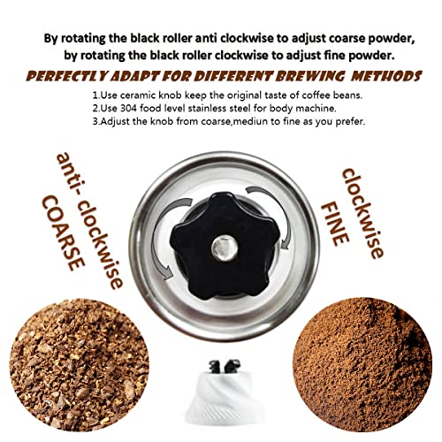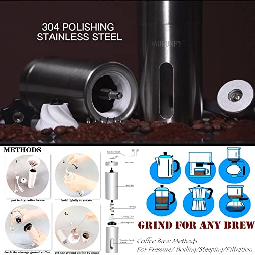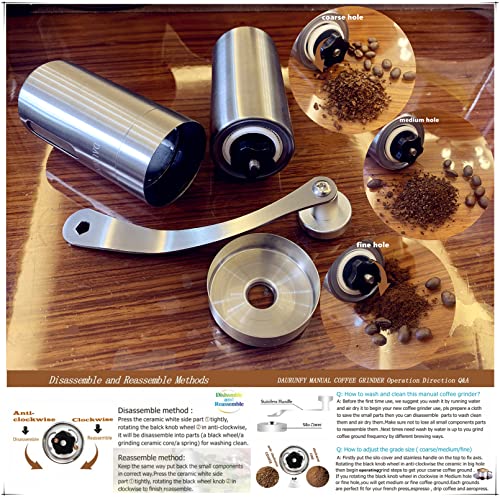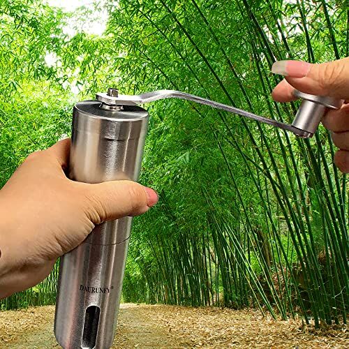Specification: DAURUNFY Manual Coffee Grinder Portable Hand Coffee Bean Mill with Ceramic Adjustable Knob Setting Stainless Steel Coffee Grinder in Kitchen and Hiking (SILVER)