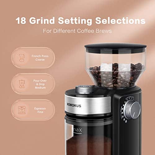 The HOMOKUS Electric Burr Coffee Grinder offers 18 grinding settings, ranging from coarse to fine. Consider the type of coffee brewing method you prefer (french press, pour over, drip coffee, or espresso) and select a grinder that can provide a consistent grind size for your chosen method.