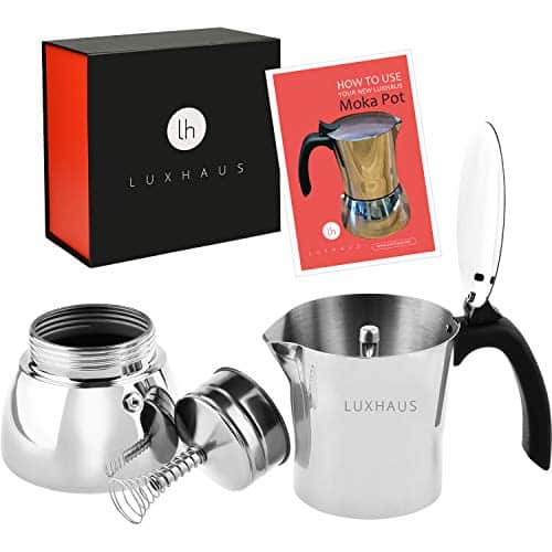 Specification: LUXHAUS Moka Pot – 6 Cup Stovetop Espresso Maker – 100% Stainless Steel Italian and Cuban Mocha Coffee Maker