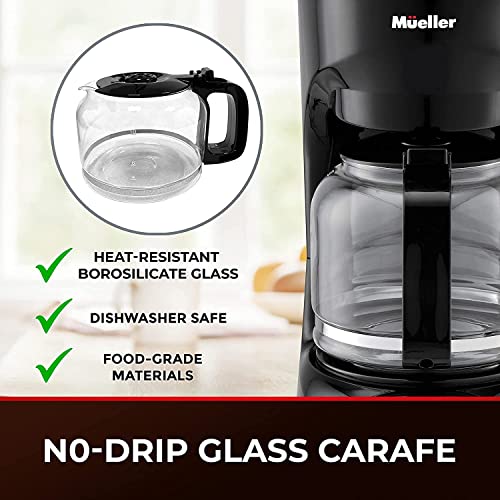 Specification: Mueller 12-Cup Drip Coffee Maker, Auto Keep Warm Function, Smart Anti-Drip System, with Permanent Filter and Borosilicate Glass Carafe, Clear Water Level Window Coffee Machine