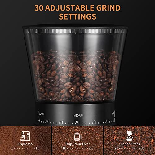 The coffee grinder features a gear reduction motor that generates a slow grinding action. This minimizes heat generated from friction, preserving the flavor and aroma of the coffee beans. With 30 precise grind settings, you can choose the perfect consistency for your preferred brewing method, ranging from an ultra-fine grind for espresso to a coarser grind for French press coffee.