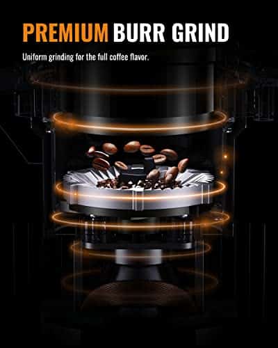 • Metallic flat burr grinder for uniform coffee grounds