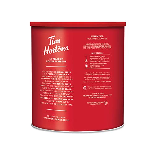 Specification: Tim Hortons Original Blend, Medium Roast Ground Coffee, Canada’s Favorite Coffee, Made with 100% Arabica Beans, 48 Ounce Canister